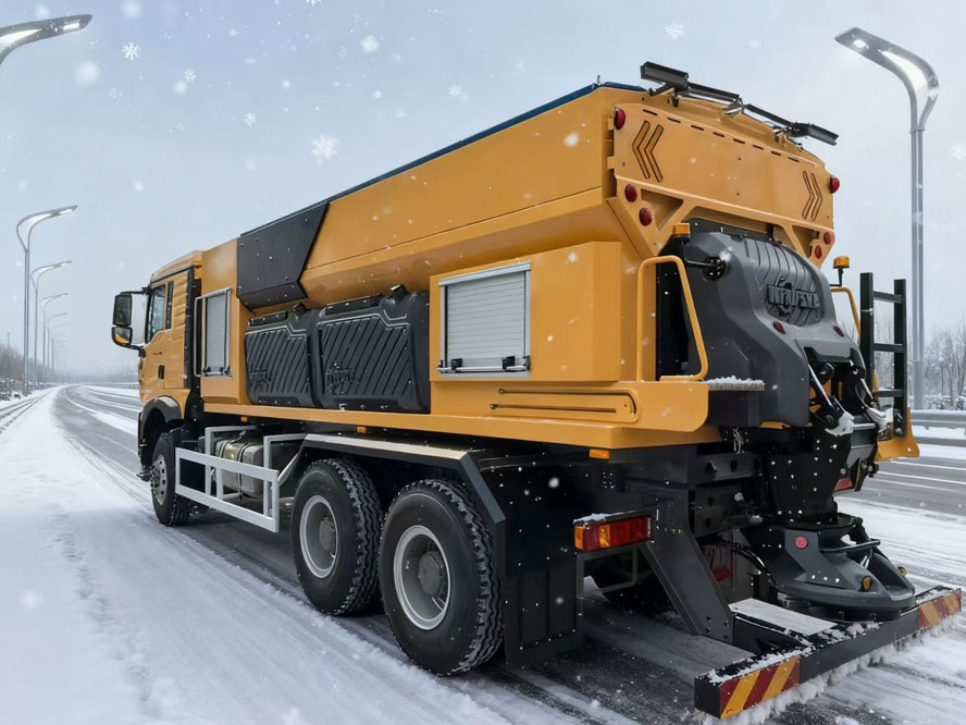 由重汽豪沃底盘前端配备扫雪滚刷(可换装除雪铲),后部加装撒布机,专用于城市道路、高速公路等的除雪作业。亦可换装除雪铲、洒水罐、护栏清洗机等作业机具进行清洗及喷洒作业
